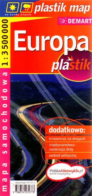 Mapa samochodowa Europy. powlekana polimerem, odporna na wszystkie warunki atmosferyczne.skala 1:3 500 000kilometraż na drogachmiędzynarodowa numeracja drógpodział polityczny