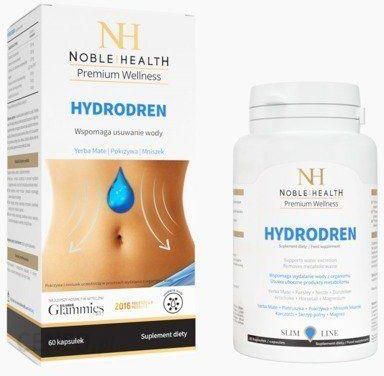 Nazwa produktu:Noble Health Hydrodren 60 kapsułekRodzaj produktu:suplement dietyOpis produktu:Hydrodren to preparat dla osób, które chcą pozbyć się z organizmu toksyn oraz nadmiaru wody. Produkt zdobył nagrodę Glamour Glammies 2017 dla najlepszego kosmetyku aptecznego. Takie wyróżnienie to potwierdzenie, że możesz zaufać temu produktowi.Składniki aktywne produktu:- Pokrzywa i mniszek uczestniczą w procesach wydalania z organizmu wody i ubocznych produktów przemiany materii.- Ziele pokrzywy, korzeń mniszka i pietruszki wspomagają zdrowie układu moczowego.- Ziele skrzypu polnego wspomaga utrzymanie prawidłowej kondycji skóry, włosów i paznokci.- Korzeń mniszka wspomaga prawidłowe funkcje trawienne, korzystnie wpływając na wątrobę i drogi żółciowe.- Hydrodren to suplement diety dla osób, które chcą pozbyć się nadmiaru wody z organizmu oraz np. wspomóc pracę układu moczowego czy trawiennego. Składniki aktywne produktu uczestniczą w procesach wydalania wody z organizmu (pokrzywa i mniszek), wspomagają zdrowie układu moczowego (ziele pokrzywy, korzeń mniszka i pietruszki ) i trawiennego (korzeń mniszka).- Pokrzywa i mniszek uczestniczą w procesach wydalania z organizmu wody i ubocznych produktów przemiany materii. Ziele pokrzywy, korzeń mniszka i pietruszki wspomagają zdrowie układu moczowego. Ziele skrzypu polnego wspomaga utrzymanie prawidłowej kondycji skóry, włosów i paznokci. Korzeń mniszka wspomaga prawidłowe funkcje trawienne, korzystnie wpływając na wątrobę i drogi żółciowe.Wykaz składników:Składniki: ekstrakt z ziela pokrzywy zwyczajnej (Urtica dioica), substancja glazurująca – hydroksypropylometyloceluloza, ekstrakt z korzenia pietruszki zwyczajnej (Petroselinum crispum), tlenek magnezu (magnez), substancja wypełniająca – celuloza mikrokrystaliczna, maltodekstryna, ekstrakt z ziela mniszka lekarskiego (Taraxacum officinale), skrobia ziemniaczana, ekstrakt z liści karczocha zwyczajnego (Cynara scolymus), ekstrakt z ziela skrzypu polnego (Equisetum arvense), substancje przeciwzbrylające – sole magnezowe kwasów tłuszczowych, dwutlenek krzemu.Ilości składników:Składniki aktywne Zawartość w 2 kapsułkach:- Ekstrakt z korzenia mniszka lekarskiego 120 mg- Ekstrakt z ziela skrzypu polnego 80 mg- Ekstrakt z ziela pokrzywy 280 mg- Ekstrakt z korzenia pietruszki 200 mg- Ekstrakt z liści karczocha 80 mg- Magnez 112,5 mg (30% RWS)*Sugerowane dawkowanie:Stosuj 2 kapsułki dziennie.Nie należy przekraczać zalecanej dawki produktu do spożycia w ciągu dnia.Instrukcja użycia:najlepiej rano, popij je szklanką wody.Przeciwwskazania:Nadwrażliwość na którykolwiek ze składników preparatu.Warunki przechowywania:Chronić od światła, przechowywać w suchym miejscu w temperaturze poniżej 25 °C, chronić przed dziećmi.Nazwa firmy produkującej środek/Adres podmiotu:Noble Health Sp. z o.o.ul. Graniczna 17 lok. 726-600 Radom POLSKAKraj lub miejsce pochodzenia:Wyprudokowano w Unii Europejskiej.Suplement diety (środek spożywczy) nie może być stosowany jako substytut zróżnicowanej diety.Celem suplementu diety jest uzupełnienie normalnej diety.Dodatkowe informacje o produkcie znajdują się w ulotce załączonej do produktu bądź na jego opakowaniu.