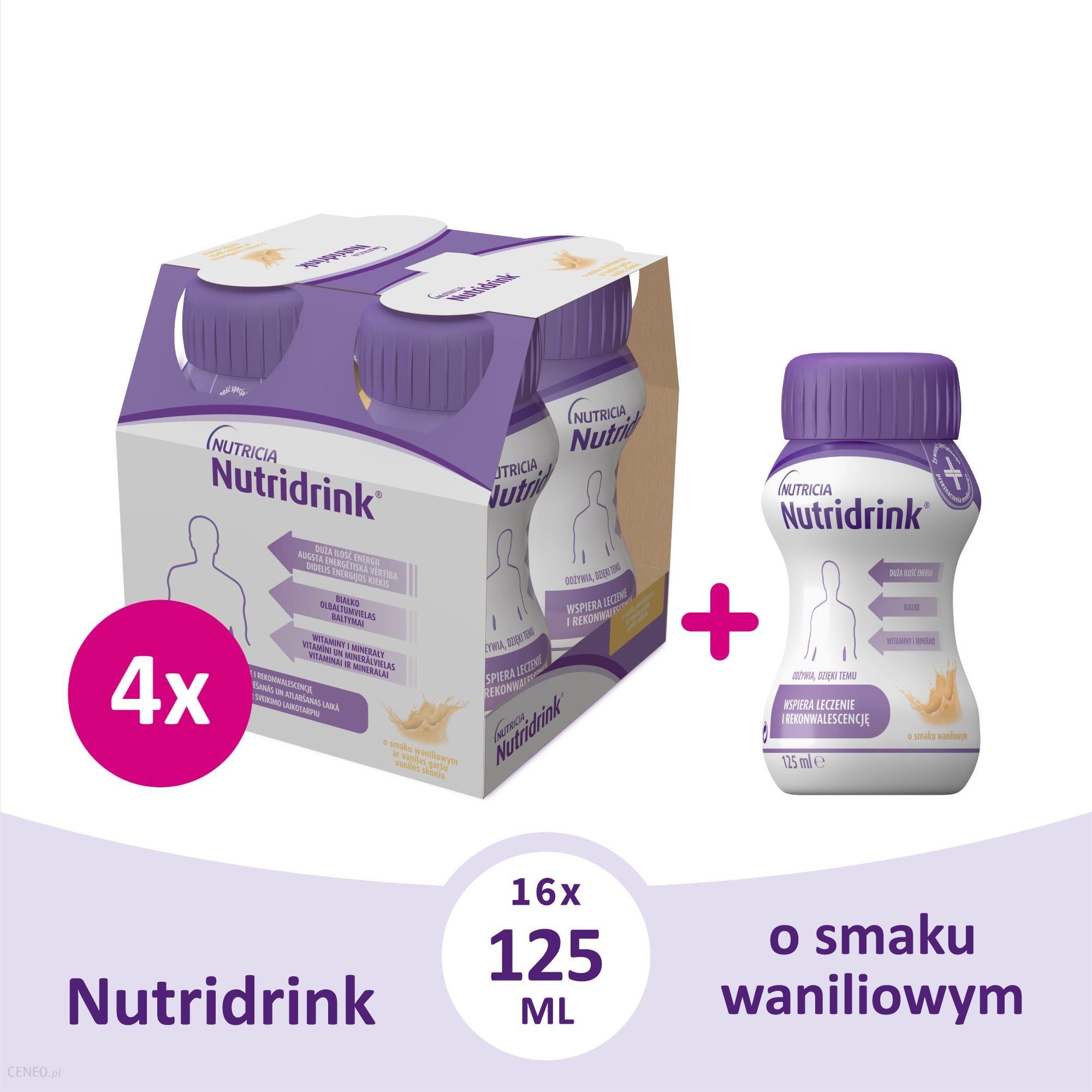 Nutridrink Protein – o smaku waniliowym, płyn, 4×125 ml Nutridrink Protein to specjalistyczny preparat odżywczy opracowany z myślą o pacjentach onkologicznych. To wysokoenergetyczny i wysokobiałkowy preparat w płynie, przeznaczony do picia. Nutridrink Protein może być stosowany jako samodzielny posiłek lub jako uzupełnienie diety pomiędzy posiłkami. Nie może stanowić jedynego źródła pożywienia.Nutridrink Protein 125 ml to skoncentrowane źródło białka, kalorii i składników odżywczych w małej objętości. Jedna butelka Nutridrink Protein to 300 kcal, 18 g białka oraz pełen skład witamin i minerałów. Dostarcza dużo energii i wszystkie składniki odżywcze niezbędne chorej osobie, która ma problem ze spożywaniem wyłącznie tradycyjnych posiłków. Dostarczenie do organizmu białka jest szczególnie ważne w przypadku chorób onkologicznych. Jest to bardzo ważny składnik niezbędny w trakcie terapii i rekonwalescencji.Preparat odżywczy Nutridrink Protein 125 ml:pomaga zoptymalizować dietę pod kątem wartości energetycznej i niezbędnych składników odżywczychzawiera największą zawartość białka w najmniejszej objętości (18 g białka w 125 ml*)jest gotowy do spożycia i łatwy do podania.Nutridrink Protein o delikatnym waniliowym smaku został przygotowany specjalnie z myślą o odżywianiu pacjentów onkologicznych.Nie zawiera glutenu i błonnika.*na podstawie analizy tego typu produktów dostępnych na rynku, 2019Zalecany do stosowania:jako przygotowanie do chemioterapii, radioterapii i operacji chirurgicznej,pomiędzy cyklami chemio- i radioterapii,w okresie rekonwalescencji,w opiece paliatywnej. Zalecane dawkowanie:Zalecane spożycie to 2 butelki dziennie przez minimum 14 dni i więcej jako uzupełnienie diety. Później stosowanie zgodnie z dalszą rekomendacją lekarza.Sposób podania:Należy pić powoli – 1 butelkę przez około 30 minut.Najlepiej podawać schłodzony.Jest gotowy do spożycia.Wstrząsnąć przed użyciem.Można dodawać do potraw, by zwiększyć ich wartość odżywczą.Dostępne smaki Nutridrink Protein 125 ml:waniliowytruskawkowymokkaowoce leśnebrzoskwinia-mangorześki smak czerwonych owocówneutralnyrozgrzewający smak owoców tropikalnych i imbiruNutridrink Protein o smaku waniliowym – Skład:woda, białka mleka krowiego, maltodektryna, cukier, oleje roślinne (olej rzepakowy, olej słonecznikowy), wodorofosforan magnezu, emulgator (lecytyna sojowa), aromat, chlorek choliny, L-askorbinian sodu, cytrynian potasu, wodofosforan dipotasu, mleczan żelaza (II), octan DL-alfa-tokoferylu, barwnik (kurkumina), octan retinylu, glukonian miedzi (II), siarczan cynku, siarczan manganu, D-pantotenian wapnia, selenian (IV) sodu, D-biotyna, chlorek chromu (III), cholekalcyferol, chlorowodorek tiaminy, kwas pteroilomonoglutaminowy, chlorowodorek pirydoksyny, nikotynamid, jodek potasu, ryboflawina, molibdenian (VI) sodu, fluorek sodu, cyjanokobalamina, fitomenadion.Wartość odżywcza w 100 ml:Wartość energetyczna1010 kJ/ 240 kcalTłuszcz, w tym:- kwasy nasycone9,4 g0,90 gWęglowodany, w tym:- cukry- laktoza24,4 g13,3 g0,30 gBłonnik 0 gBiałko14,4 gSól0,10 gWitaminy:Witamina A260 µgWitamina D2,10 µgWitamina E3,70 mg (alfa-TE/ET)Witamina K16,0 µgTiamina0,45 mgRyboflawina0,50 mgNiacyna (3,6 mg NE/EN)0,59 mgKwas pantotenowy1,60 mgWitamina B60,53 mgKwas foliowy80,0 µgWitamina B121,10 µgBiotyna12,0 µgWitamina C30,0 mgSkładniki mineralne i pierwiastki śladowe:Na40 mgK105 mgCl60 mgCa350 mgP300 mgMg55 mgFe2,1 mgZn2,4 mgCu0,35 mgMn0,63 mgF0,19 mgMo20 µgSe14 µgCr13 µgI46 µgInne:Cholina110 mgOsmolarność570 mOsmol/lProcent (%) energii z:- tłuszczu- węglowodanów- błonnika- białka35%41%0%24%Produkt bezglutenowy. Pakowany w atmosferze ochronnej. Sterylizowany UHT.Środki ostrożności:Produkt nie jest przeznaczony do stosowania pozajelitowego.Stosować pod nadzorem lekarza.Produkt nieodpowiedni do stosowania jako jedyne źródło pożywienia.Nie stosować u dzieci w wieku poniżej 3 lat.Stosować ostrożnie u dzieci w wieku 3-6 lat.Monitorować podaż płynów, aby zapewnić odpowiedni stan nawodnienia pacjenta.Ze względu na wysoką zawartość białka produkt nie jest odpowiedni dla pacjentów z niewydolnością nerek.Przechowywanie produktu:Po pierwszym otwarciu opakowania produkt przechowywać w lodówce, nie dłużej niż przez 24 godziny.Producent / Kraj pochodzenia:N.V. Nutricia, Zoetermeer, HolandiaNUTRICIA Polska Sp. z o.o. | ul. Bobrowiecka 8, 00-728 WarszawaNutridrink Protein – żywność specjalnego przeznaczenia medycznego do postępowania dietetycznego w niedożywieniu związanym z chorobą. Stosować pod nadzorem lekarza.